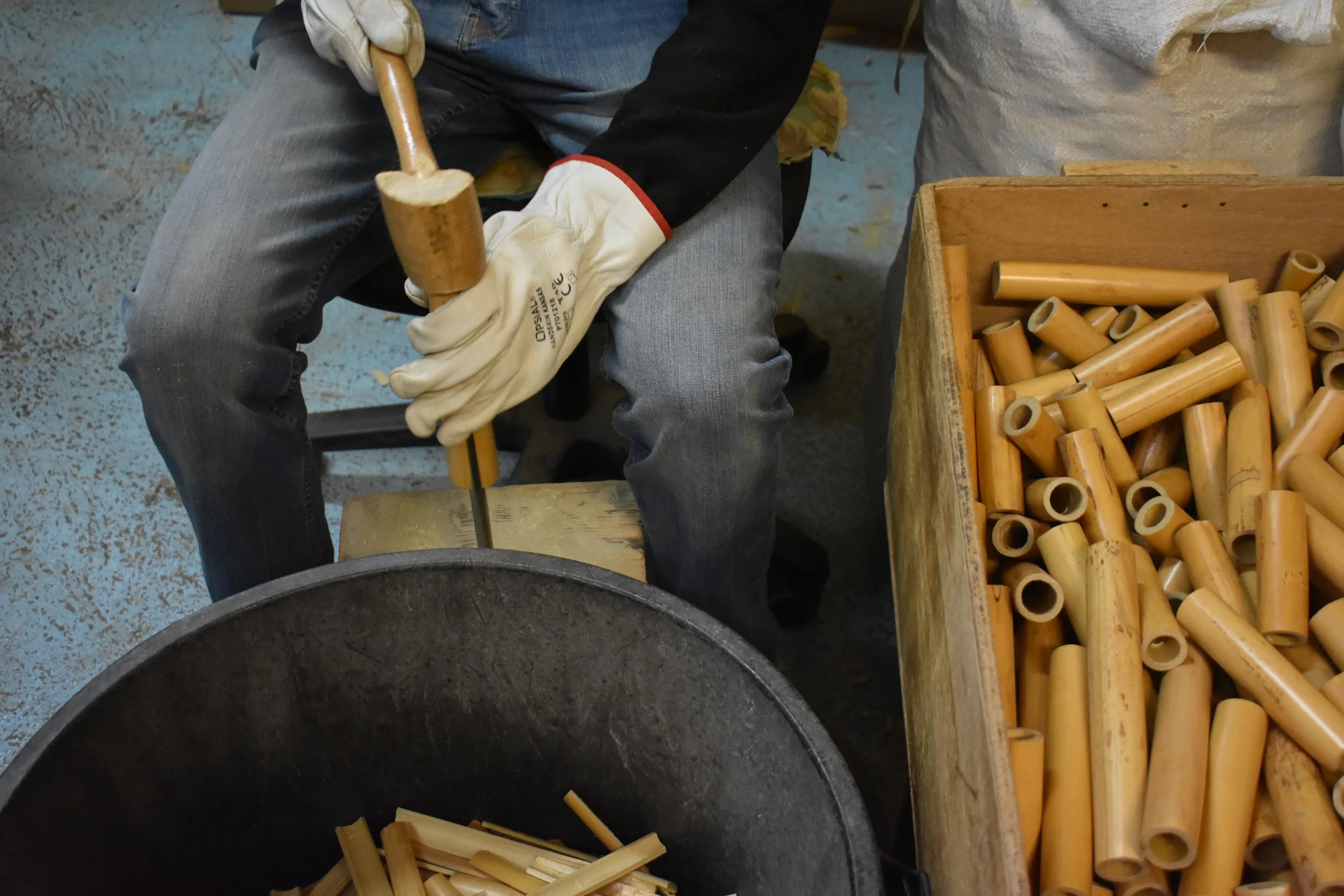 Aujourd’hui je récupère les rebuts issus de la manufacture MARCA à Ollioules, productrice d’anches depuis 1957. Les anches entaillées